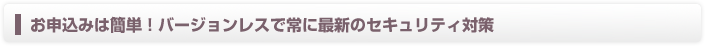 「お申込み」ページの「製品購入」からカンタン申込。後はガイダンスに沿ってダウンロード/インストールいただくだけです。アップデートはもちろんバージョンアップも全自動だから、常に最新のセキュリティ対策が自動的に可能。更に月額課金型だから1年毎の再申込手続きも不要です。